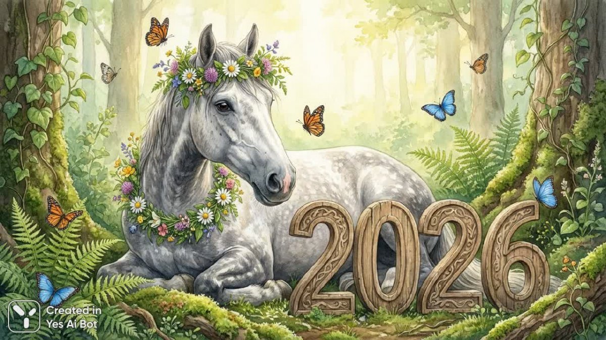 delightful watercolor horse with a gentle smile, adorned in a floral garland, nestled near wooden "2026" letters, surrounded by butterflies and lush greenery, serene and tranquil moment, nature-inspired illustration.