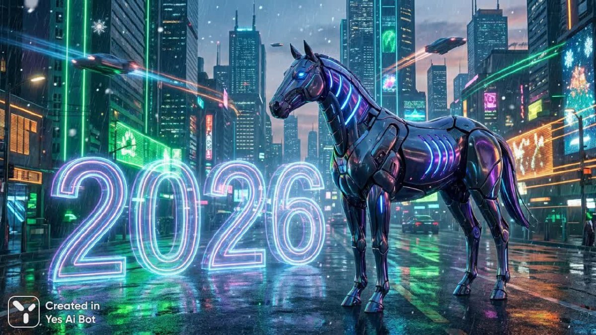 futuristic sleek horse with glowing accents, standing proudly by shimmering holographic "2026" digits, cyberpunk city skyline in the background, electric colors and dynamic lighting, high-tech holiday theme.