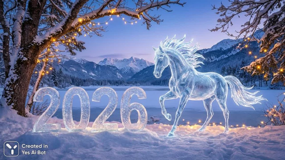 magical picturesque landscape, elegant horse made of sparkling ice, graceful pose next to shimmering "2026" numbers, ambient fairy lights twinkling, serene winter atmosphere, artistic watercolor style.