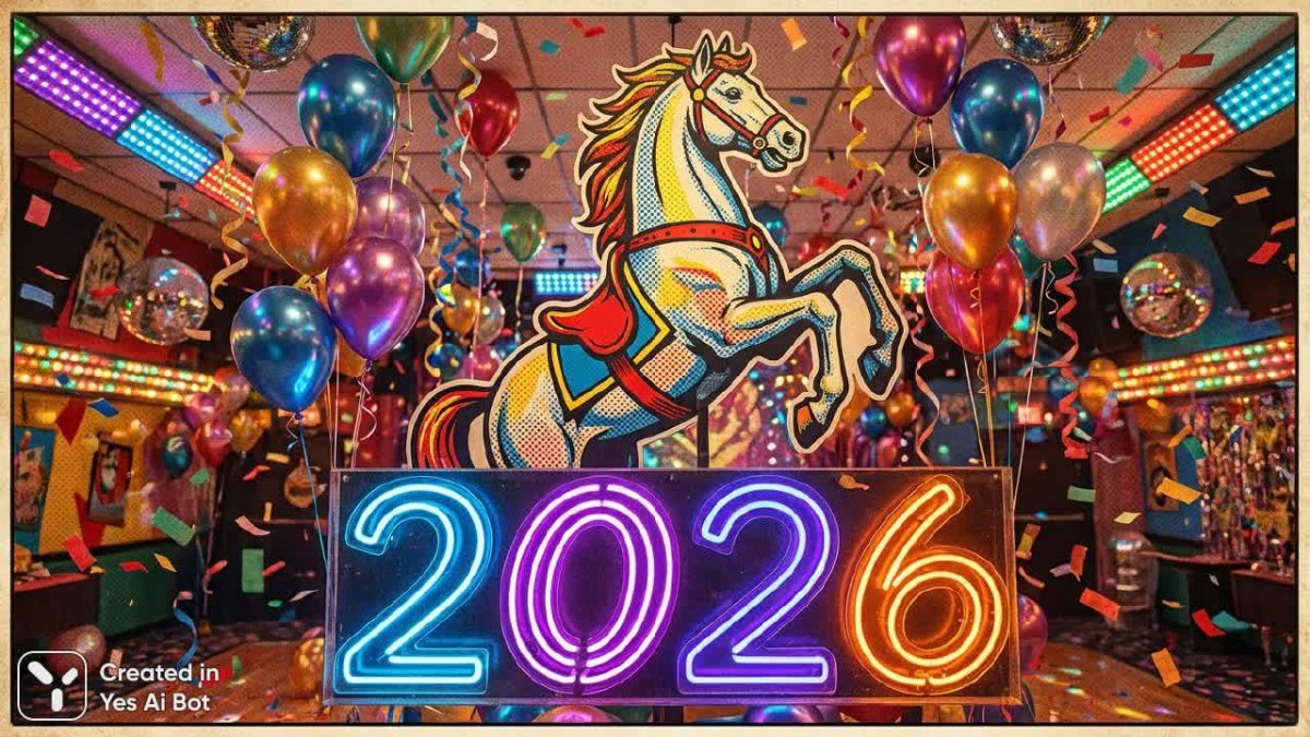 vintage pop art horse in a playful pose, surrounded by colorful balloons and confetti, the bold numbers "2026" in neon font, retro aesthetic combined with a lively New Year’s celebration, dynamic and fun.