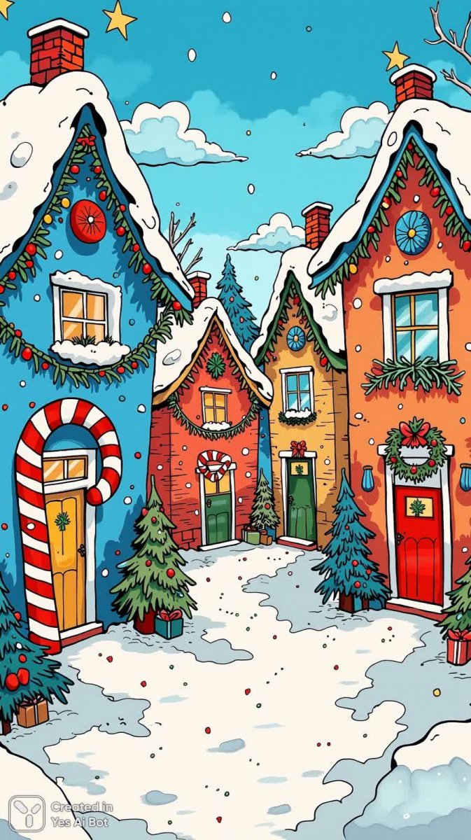 zentangle, colorful cartoon houses decorated for christmas, with candy canes and festive garlands, set against a backdrop of a bright blue sky and fluffy clouds, evoking a sense of playful joy and holiday spirit.