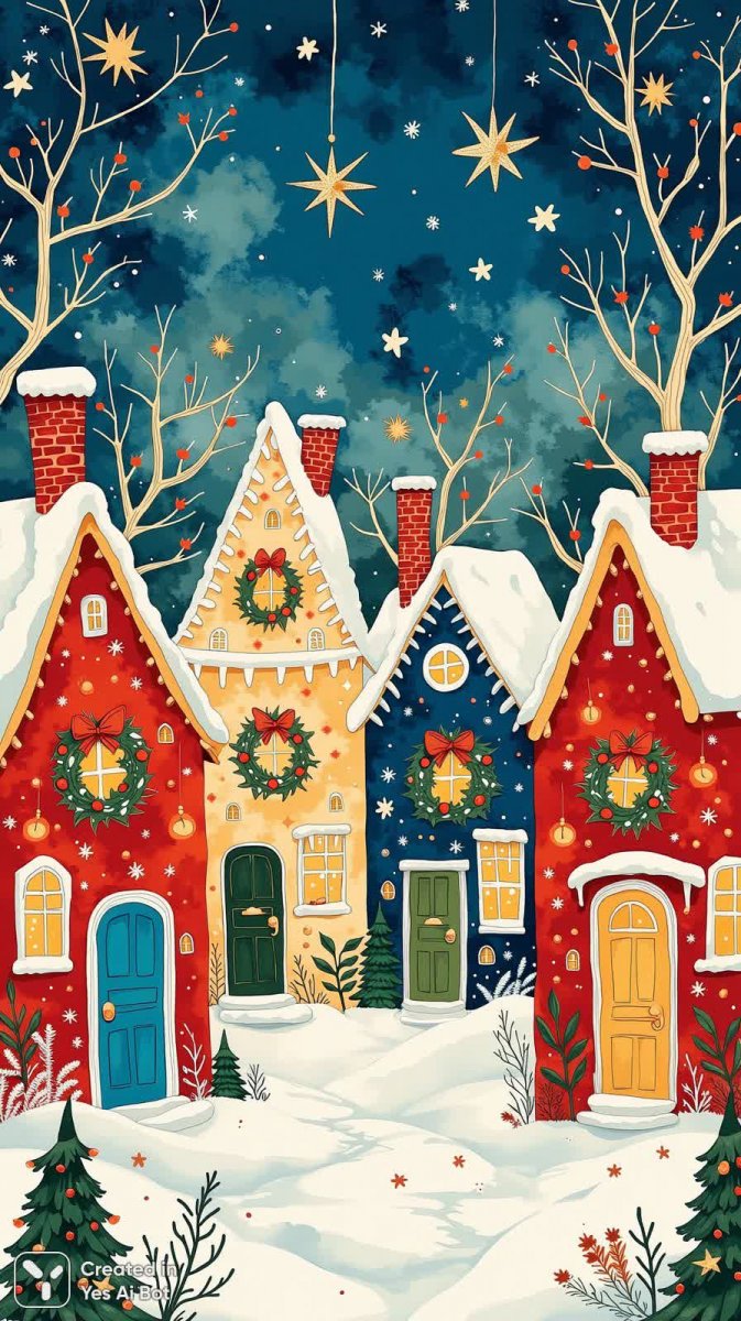 paper cut gouache illustration, charming cottages with festive wreaths and twinkling stars in the sky, vibrant colors and intricate patterns creating a whimsical atmosphere that invites the holiday cheer.