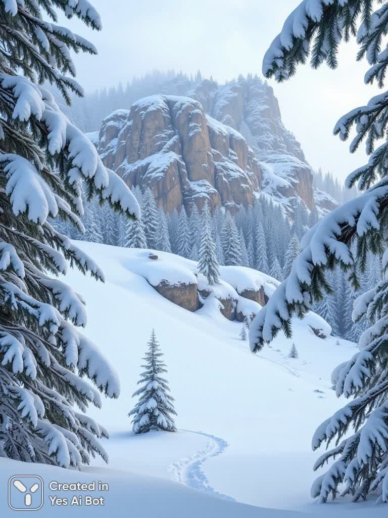 Заснеженный зимний пейзаж поражает своей величественной красотой и безмолвной тишиной. Огромные сугробы покрывают скалистые образования на заднем плане, создавая ощущение бескрайней холодной пустоты. На переднем плане возвышаются заснеженные ели с тяжелыми ветвями, добавляя глубины и объема композиции. Мягкий рассеянный свет, словно пробивающийся сквозь облака, подчеркивает умиротворенность и отрешенность этой зимней сцены. Преобладание оттенков белого и голубого создает ощущение прохлады и спокойствия, а акцент на текстуре снега и камня позволяет ощутить их различие – грубую неровность скал и мягкую пушистость сугробов. Естественная рамка из деревьев направляет взгляд зрителя к центральному объекту – массивным каменным формациям, которые кажутся бесконечными благодаря слегка возвышенной точке съемки. Вся атмосфера пронизана свежестью и холодом, передавая неповторимую красоту зимней природы через призму фотореалистичного стиля, словно запечатленная в момент абсолютного покоя и безмятежности. Этот пейзаж – гимн монументальности зимы и ее способности погружать в состояние глубокого созерцания и умиротворения