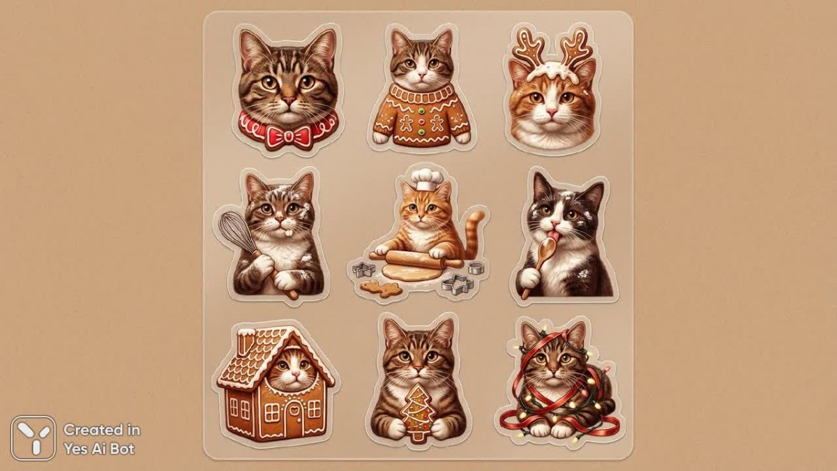 nanobanana Кошачьи новогодние наклейки: милый минимализм в стиле векторной графики. Нейронная сеть NanoBanana