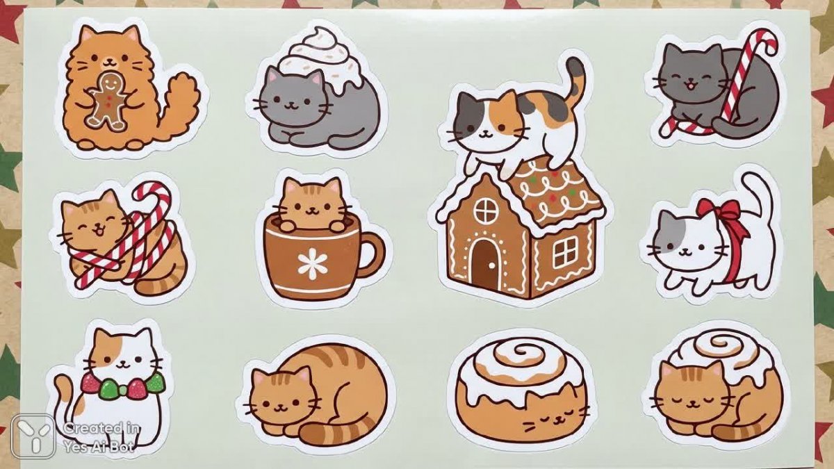 sticker's, 2d, png, vector art, minimalism collection of 12 cute cat stickers, featuring cats in gingerbread-themed outfits, arranged in grid pattern, top left cat is holding a gingerbread cookie, next cat wears a frosting hat, center has a cat perched on a giant gingerbread house, each cat in different whimsical poses, background is festive and colorful with stars.