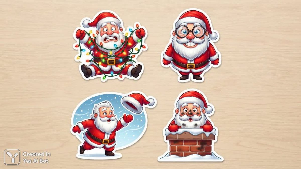 sticker's, 2d, png, vector art, minimalism, collection of quirky santa graphics in different funny situations, one sticker shows santa tangled in lights, next features santa chasing his falling hat, others include santa wearing oversized glasses, all illustrations filled with cheerful colors and lighthearted expressions.