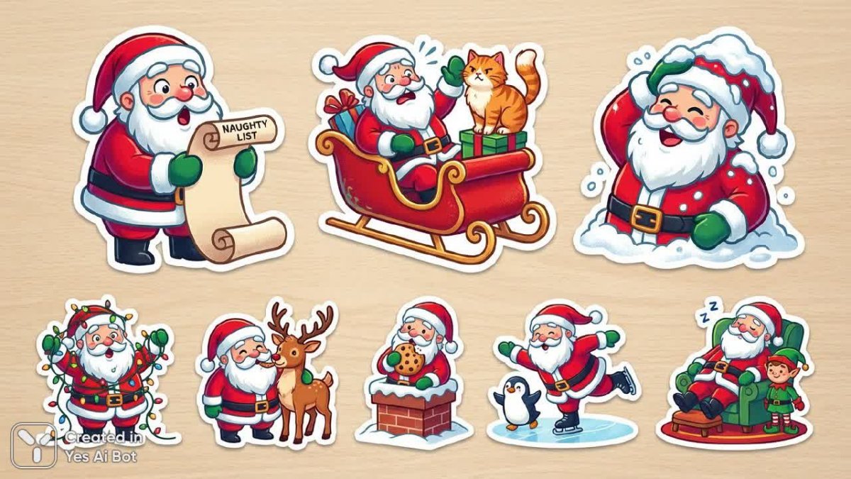 sticker's, 2d, png, vector art, minimalism, collection of nine playful illustrations of santa in comedic scenarios, first sticker shows santa reading a naughty list with a surprised expression, second features santa attempting to get a cat off his sleigh, third shows santa getting covered in snow while laughing, illustrations are vibrant and full of holiday spirit.