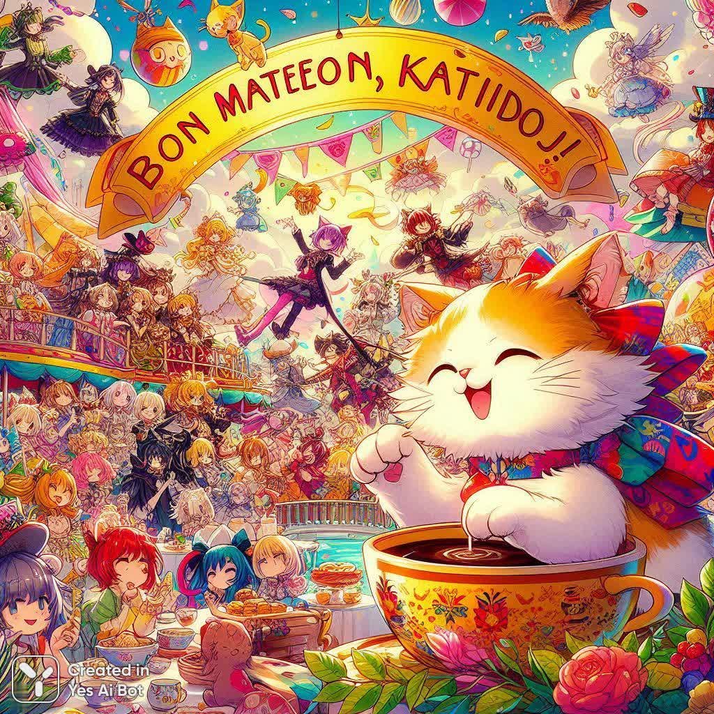 Забавное и необычное сочетание милоты и эксцентричности демонстрирует эта яркая иллюстрация. В центре внимания – очаровательный котик, по-хозяйски устроившийся с чашкой ароматного чая в компании группы энтузиастов косплея, вдохновленных аниме. Их костюмы пестрят деталями и отражают любовь к любимым персонажам, создавая атмосферу праздника и творчества. Над головами собравшихся красуется необычный транспарант с загадочной надписью 'Bonan matenon, katidoj!', добавляющий сцене нотку юмора и таинственности. Общий стиль работы выполнен в характерной манере аниме, с плавными линиями, яркими цветами и выразительными эмоциями на лицах персонажей. Эта картина – настоящий гимн дружбе, творчеству и любви к японской анимации, приглашающий зрителя окунуться в мир фантазий и волшебства. Она сочетает в себе элементы фэнтези с визуальным языком аниме, создавая уникальный и запоминающийся образ. Это визуальная история о радости общения, самовыражении и умении находить красоту в самых неожиданных ситуациях. Изображение излучает позитив и беззаботность, заставляя улыбнуться и почувствовать теплоту момента
