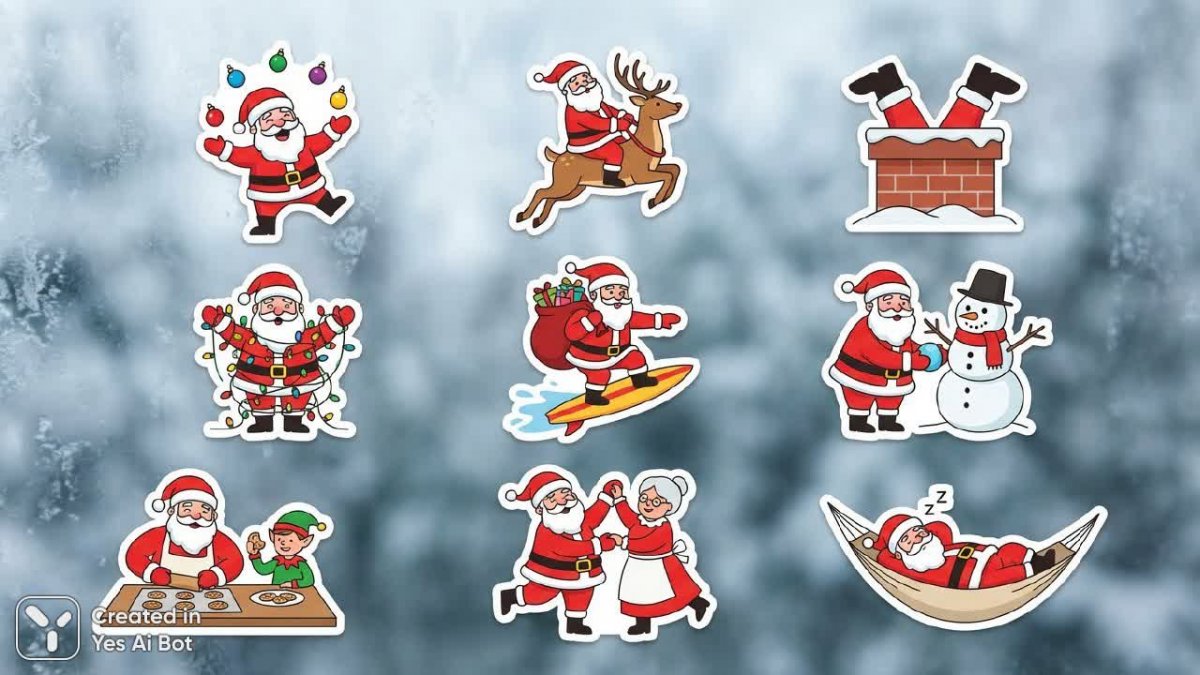 sticker's, 2d, png, vector art, minimalism, collection of humorous santa illustrations, nine stickers featuring santa in playful poses, first sticker shows santa laughing while juggling Christmas ornaments, second sticker displays santa riding a reindeer backwards, third sticker features santa stuck in a chimney with only his legs sticking out, each sticker colorful and whimsical against a soft snowy background.