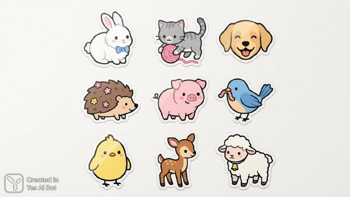 sticker's, 2d, png, bold line, vector art, minimalism collection of adorable animal stickers, nine illustrations arranged in grid format, top left shows a fluffy bunny wearing a bowtie, next to a kitten playing with a ball of yarn, center sticker is a playful puppy with a big smile, second row includes a hedgehog with flowers on its back and a chubby piglet, third row features a cheerful little chick and a graceful baby deer, all stickers in soft pastel colors with simple lines for an appealing minimalist style.