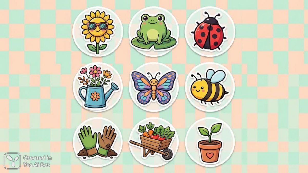 sticker's, 2d, png, bold line, vector art, minimalism collection of playful garden-themed stickers, arranged in grid with nine stickers, top left sticker features a smiling sunflower wearing sunglasses, adjacent sticker shows a cute frog sitting on a lily pad, next to a bright red ladybug, center sticker depicts a watering can with flowers blossoming out, second row includes a cartoon butterfly with colorful wings and a bee with happy expression, bottom row shows a pair of gardening gloves with dirt, and a wheelbarrow filled with vegetables, all illustrations in vibrant colors, soft pastel BG.