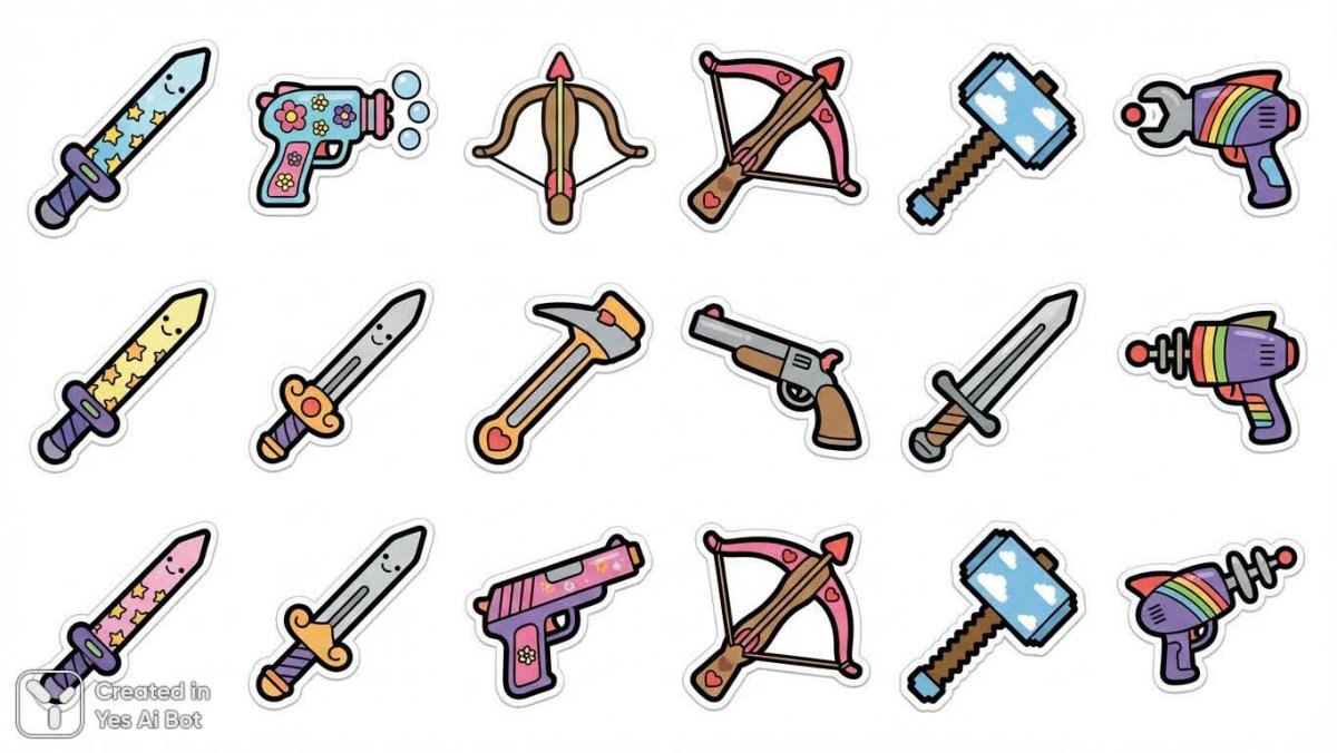 sticker's, 2d, png, bold line, vector art, minimalism collection of 20 playful weapon icons, combining elements of traditional and futuristic designs, arranged in a balanced grid, each weapon decorated with fun motifs and cheerful colors, BG is minimalistic white to highlight the illustrations.