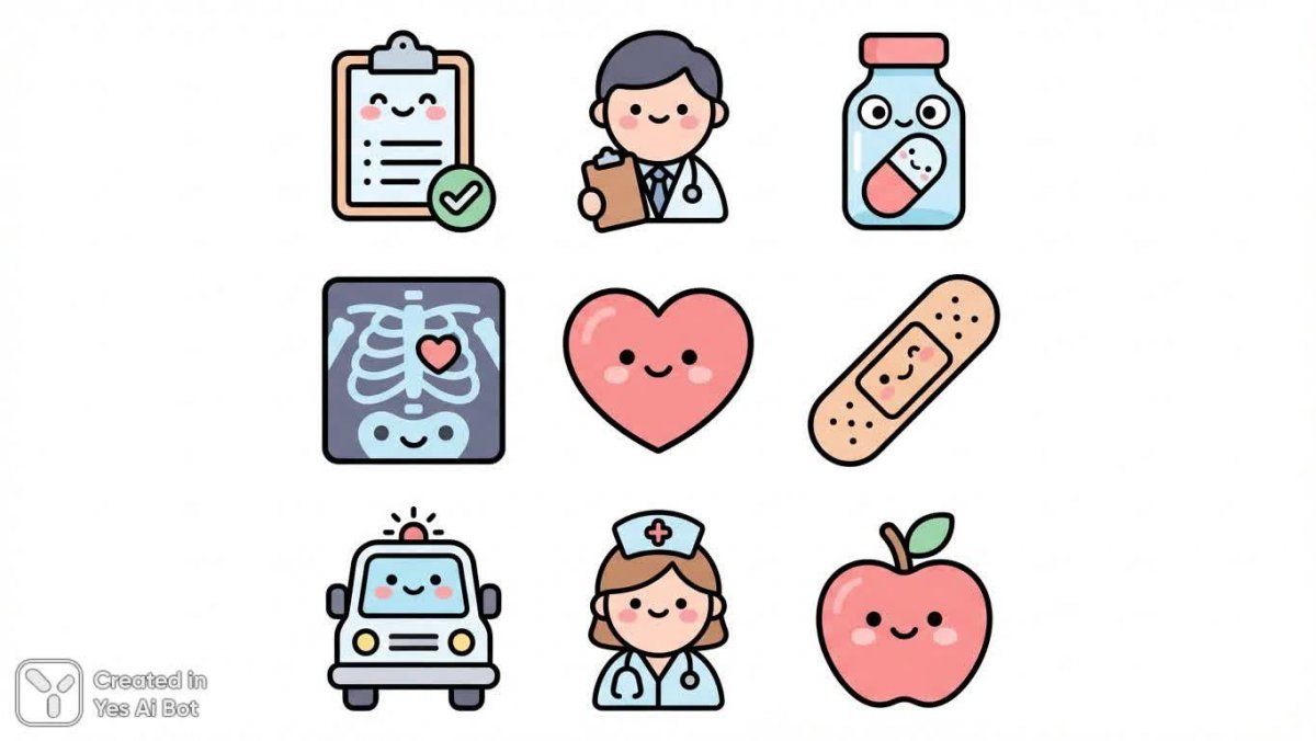 2d, png, bold line, vector art, different, minimalism collection of 9 adorable health-themed icons, arranged in a cozy grid, first icon shows a smiling health check-up chart, next is a kind doctor holding a clipboard, third showcases a happy pill in a bottle with googly eyes, fourth is a cheerful syringe with a big smile, middle row includes a friendly x-ray image, a cute bandage on a heart, bottom row shows an ambulance with a happy face and a nurse with a stethoscope, all in a soft pastel palette, BG is white.