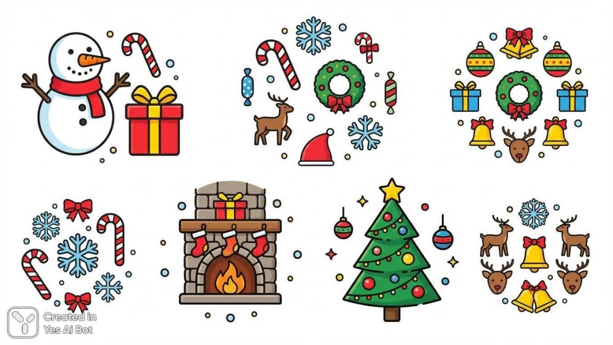 2D, png, bold line, vector art, different, minimalism, bg is white, collection of whimsical icons depicting holiday elements, arranged in circular shapes, top left icon shows a snowman with a carrot nose, next to a bright red gift box with a bow, bottom row features a fireplace with stockings and a decorated tree, each icon in cheerful colors and playful design.