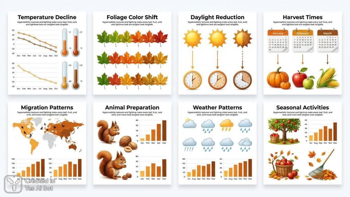 collection of 8 infographics illustrating the seasonal changes in autumn, each infographic contains visual data about temperature, foliage colors, and harvest times, arranged in a clean and informative layout for presentations, colors reflecting fall vibes—orange, brown, yellow, and green, each section highlights a different aspect of autumn, designed for educational purposes, bg is white.