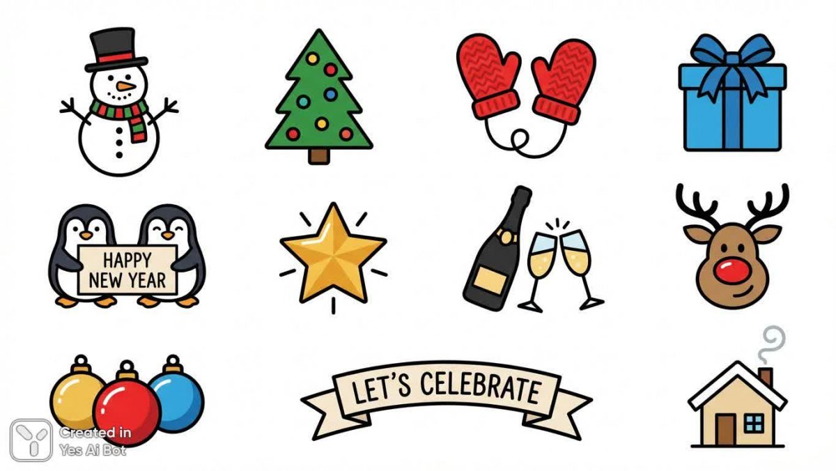 2d, png, bold line, vector art, different, minimalism, bg is white collection of twelve new year-themed stickers, arranged in grid of three rows and four columns, first row features a snowman wearing a scarf and top hat, next sticker is a christmas tree with colorful ornaments, third sticker shows a pair of red mittens, fourth sticker is a blue gift box with a big bow on top; second row includes two penguins holding a sign that says "happy new year", followed by a golden star, next sticker is a bottle of champagne with glasses, bottom left showcases a reindeer with a red nose, and the last one is an illustration of a cozy house with smoke com...