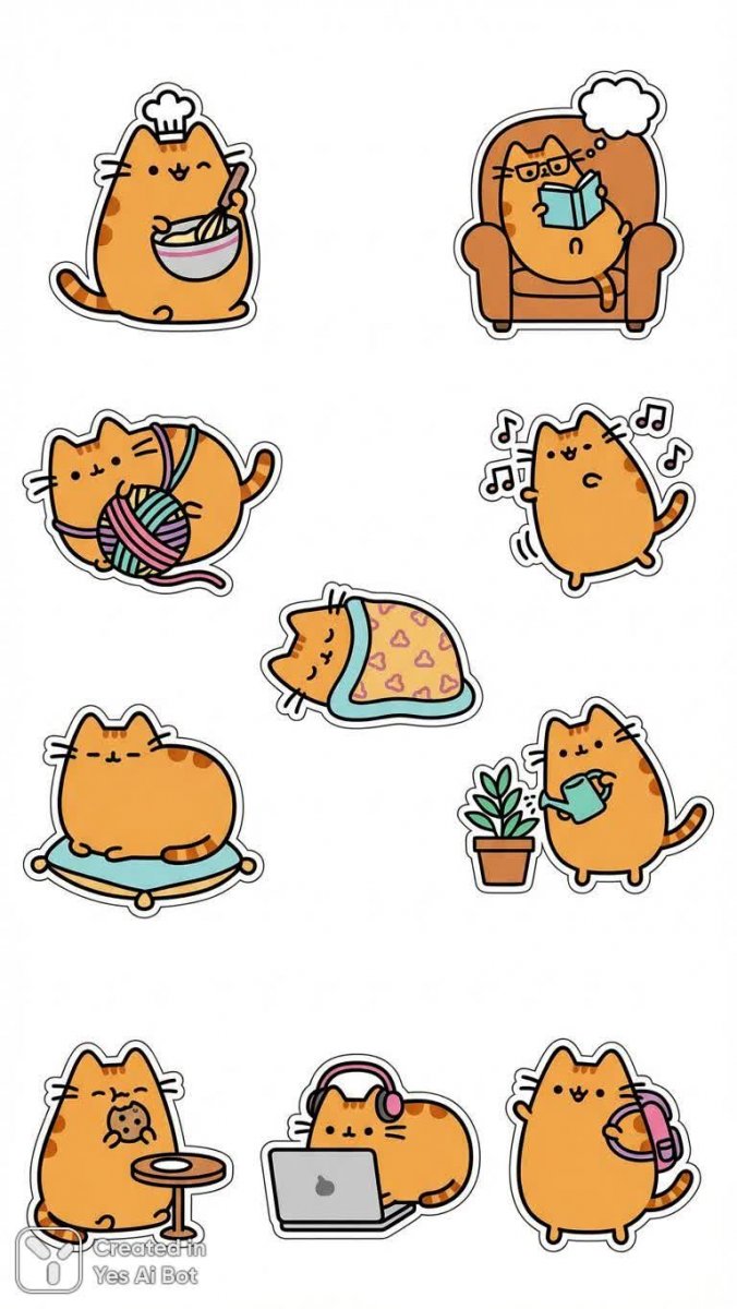 2D, png, bold line, vector art, different, minimalism, bg is white compilation of 9 adorable stickers of ginger pusheen cat doing everyday activities, arranged in a fun grid, features her cooking, reading a book, dancing, and playing with yarn, showcasing distinct facial expressions and colorful details, all set against a clean, white background to enhance the minimalist style.