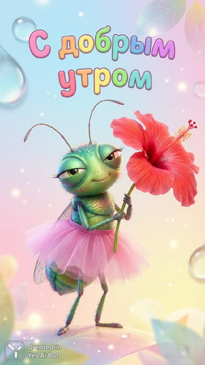 Text on russian: "С добрым утром!", a playful cgi rendering features a quirky green insect with large slanted eyes, wearing a fluffy pink tutu and holding a vibrant red hibiscus flower, set against a soft pastel background that enhances its whimsical nature.
