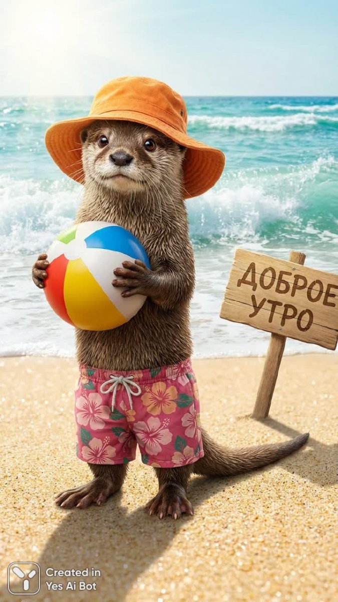 text on russian: "good morning!" a playful anthropomorphic otter with big curious eyes, wearing a vibrant orange sunhat and pink floral shorts. it stands on a sunny beach, holding a colorful beach ball, with splashes of aqua waves visible in the background. the soft golden sand sparkles under the bright sunlight.