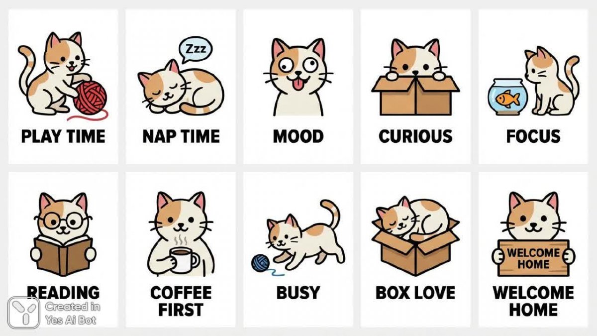 2d, png, bold line, vector art, different, minimalism, bg is white, collection of 10 infographics featuring cute cats with various expressions, arranged in grid layout, first infographic showcases a playful cat playing with yarn, second infographic displays a sleeping cat with text "nap time", third features a cat with a funny face and text "mood", fourth has a curious cat peeking from a box, fifth includes a cat looking at a fish bowl, sixth shows a cat wearing glasses reading a book, seventh infographic features a cat holding a coffee cup, eighth showcases a cat playing with a ball of string, ninth features a cat in a cardboard box, tenth i...