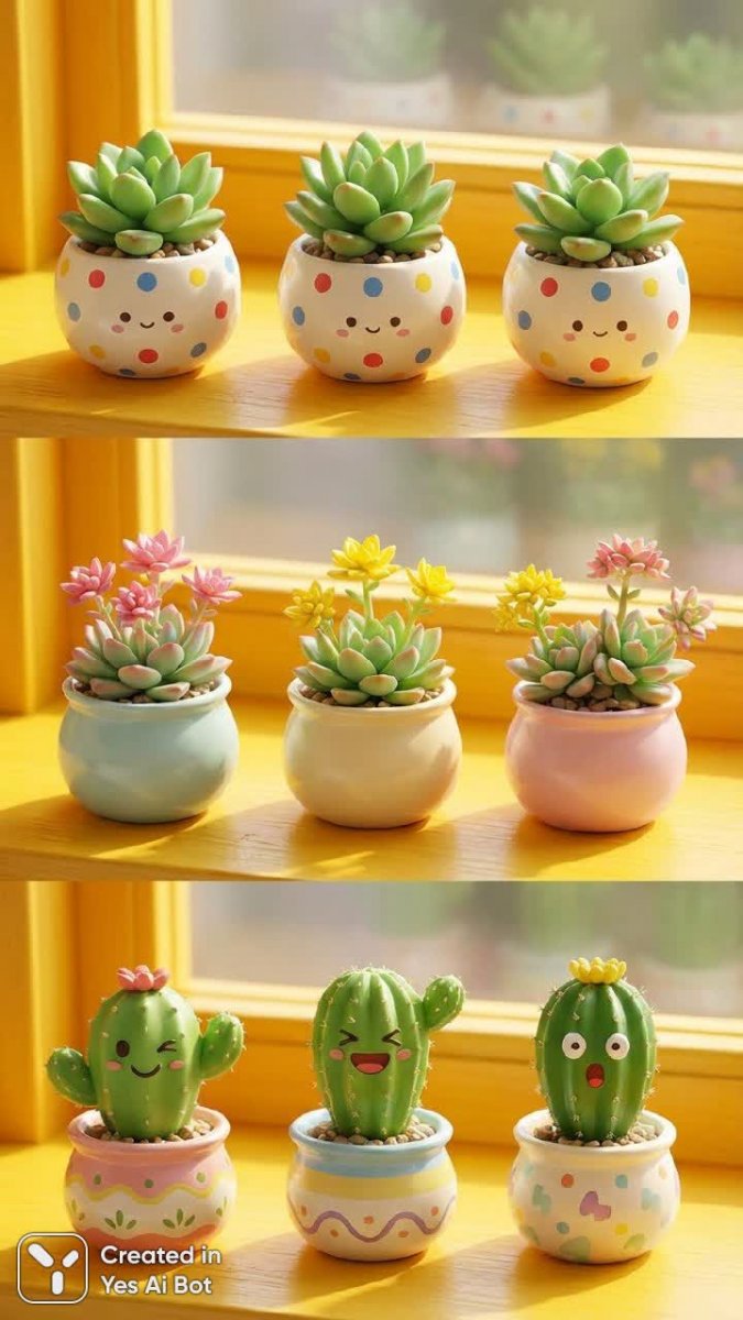 Веселые суккуленты в ярких горшочках: солнечная композиция для хорошего настроения. Генерация из нейросети NanoBanana