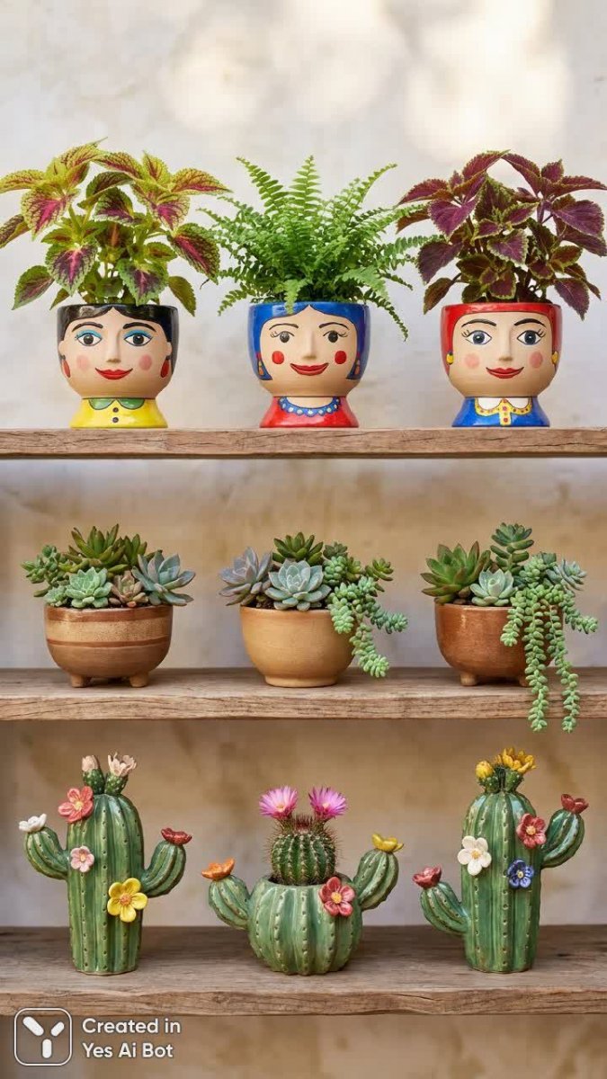 Удивительная коллекция наивного искусства представлена в виде девяти очаровательных кашпо с разнообразными растениями, элегантно расположенных в три ряда. Первый ряд радует глаз яркими растениями с дружелюбными лицами, создавая атмосферу радости и позитива. Второй ряд демонстрирует миниатюрные суккуленты, аккуратно размещенные в полосатых горшочках – сочетание простоты и стиля. Завершающий третий ряд поражает воображение причудливыми дизайнами кактусов, украшенных нежными цветами, добавляя нотку сказочности и экзотики. Мягкий и светлый фон создает ощущение спокойствия и уюта, подчеркивая красоту и уникальность каждого растения. Эта композиция – настоящее произведение искусства, сочетающее в себе любовь к природе и креативный подход к оформлению интерьера. Коллекция станет прекрасным украшением любого пространства, наполняя его позитивной энергией и вдохновляя на новые свершения. Яркие цвета и необычные формы растений создают неповторимую атмосферу тепла и гостеприимства. Это идеальный выбор для тех, кто ценит оригинальность и хочет добавить в свой дом немного волшебства и индивидуальности. Насладитесь этой замечательной коллекцией, которая подарит вам массу положительных эмоций и станет источником вдохновения каждый день. Она идеально подходит для создания уютной атмосферы в доме или офисе, а также может быть прекрасным подарком для близких людей