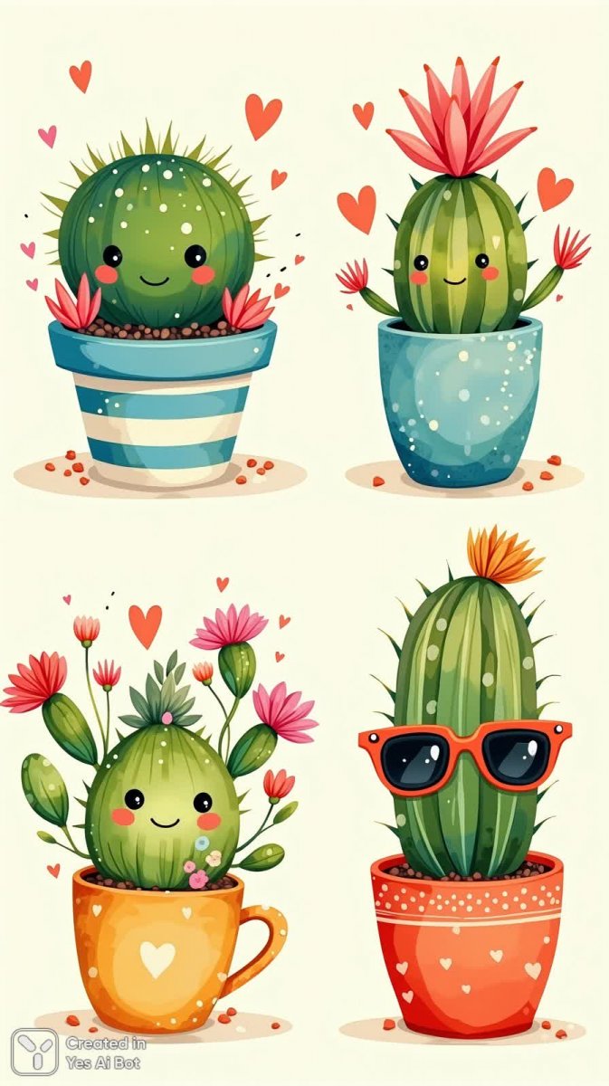 Первая работа демонстрирует круглый кактус, украшенный веселыми горошинами, сидящий в полосатом синем горшке. Вторая иллюстрация изображает пушистый суккулент, окруженный множеством крошечных сердечек, символизирующих нежность и заботу. Третья картина запечатлела улыбающееся растение, которое весело выглядывает из кофейной кружки, добавляя позитива в повседневную жизнь. Завершает серию высокий кактус в стильных солнцезащитных очках с яркими цветами, излучающий беззаботность и летнее настроение.