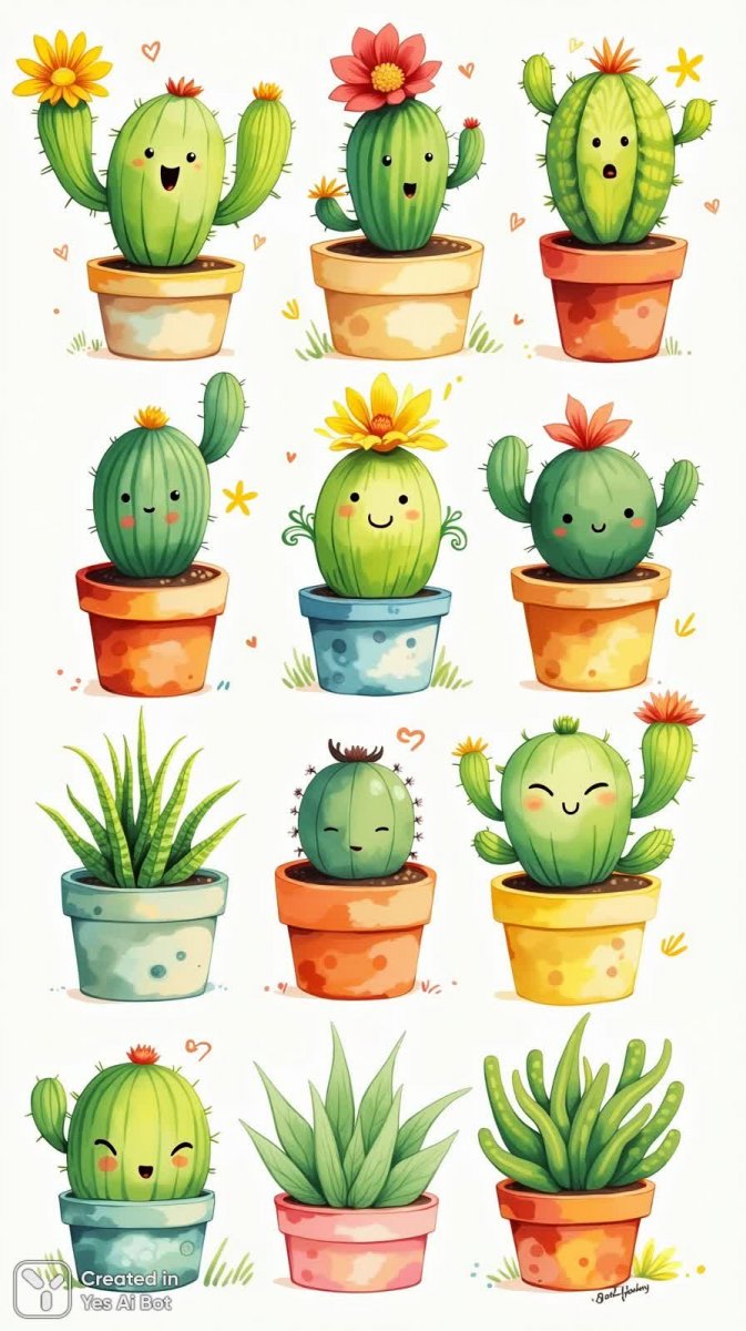 Забавный калейдоскоп колючих друзей! Эта очаровательная коллекция из девяти кактусов покорит ваше сердце своим беззаботным настроением и игривыми выражениями лиц. Расположенные в аккуратных трех строках по три растения, эти милые создания словно сошли со страниц детской сказки. В первом ряду вас встречает радостный кактус с ярким желтым цветком – воплощение солнечного настроения. Следующая строка представляет пару удивленных кактусов, уютно расположившихся в разноцветных горшках, добавляя композиции динамики и живости. Завершает этот милый ряд троица улыбающихся суккулентов различных оттенков зеленого, излучающих спокойствие и гармонию. Фон изображения выполнен в ярких и причудливых тонах, создавая атмосферу волшебства и уюта. Это прекрасное дополнение к любому интерьеру, способное поднять настроение и привнести нотку оригинальности в ваш дом или офис. Идеально подойдет для тех, кто любит все необычное и милое, а также ценит позитивные эмоции и яркие цвета. Погрузитесь в мир колючих радостей с этой удивительной коллекцией кактусов!