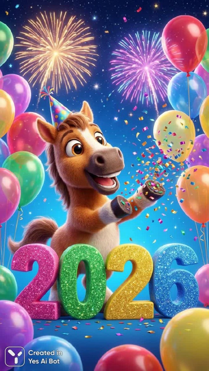 Веселый праздник на пороге! Яркий мультяшный конь с беззаботной детской непосредственностью затевает феерическое шествие радости и предвкушения. Он игриво разбрасывает конфетти над огромными, сверкающими цифрами '2026', символизирующими грядущее событие или юбилей. За конем простирается энергичный фон, украшенный буйством красок: множество разноцветных воздушных шаров поднимаются ввысь, а искрящиеся фейерверки расцвечивают небо праздничными огнями. Эта жизнерадостная иллюстрация излучает позитив и создает атмосферу волшебства, наполняя сердца зрителей предвкушением счастливых моментов и незабываемых впечатлений. Кажется, что сама атмосфера пропитана детской верой в чудеса и безграничной радостью от предстоящего торжества. Вся композиция наполнена легкостью и оптимизмом, призывая к празднованию и веселью воодушевляя всех вокруг своим искренним настроением. Это настоящий гимн позитиву и хорошему настроению, который обещает подарить море улыбок и незабываемых эмоций