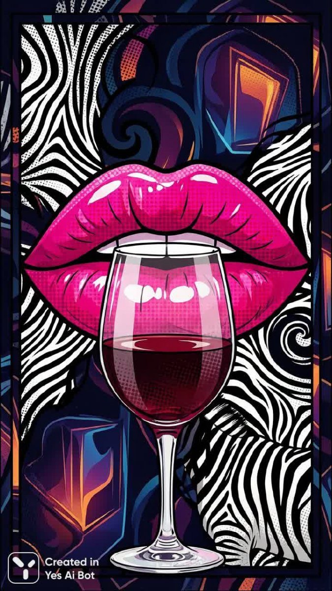 a colored illustration featuring glossy pink lips and a wine glass, highlighted by unique patterns of black zebra stripes and a captivating dark background, evoking a pop art style.
