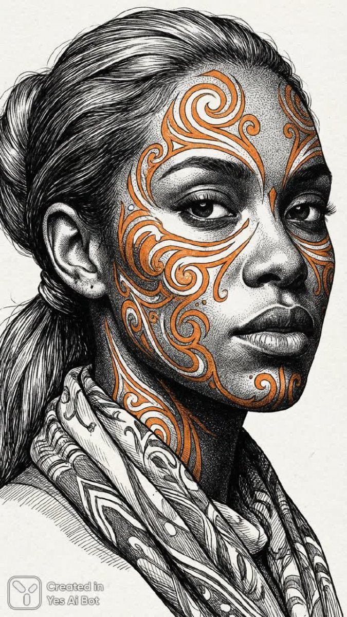 in a high-resolution ink drawing illustration, a striking portrait of a beautiful woman with orange and white striped makeup, showcasing vibrant colors and bold makeup design that contrasts beautifully with her skin tone.