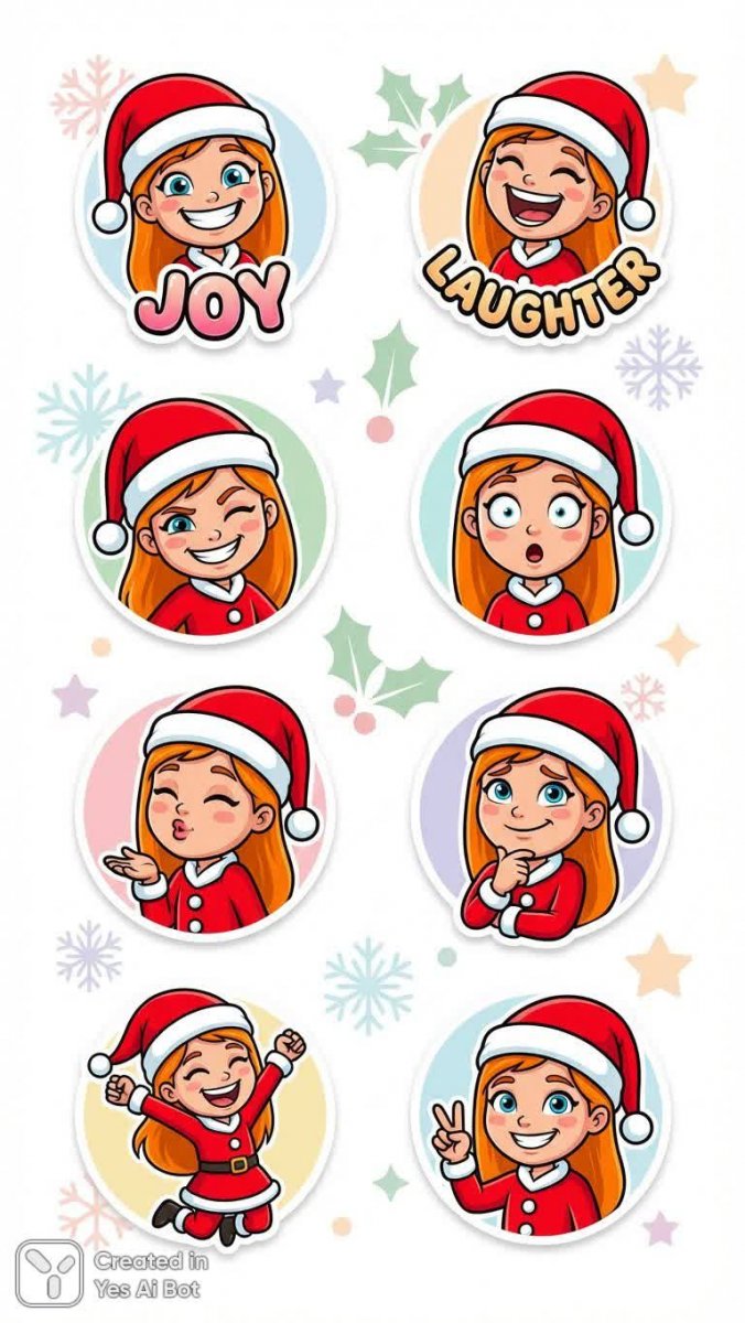 nanobanana Новогодние стикеры: оранжевоволосая девочка в костюме Санты и праздничные эмоции. Изображение из нейронной сети NanoBanana