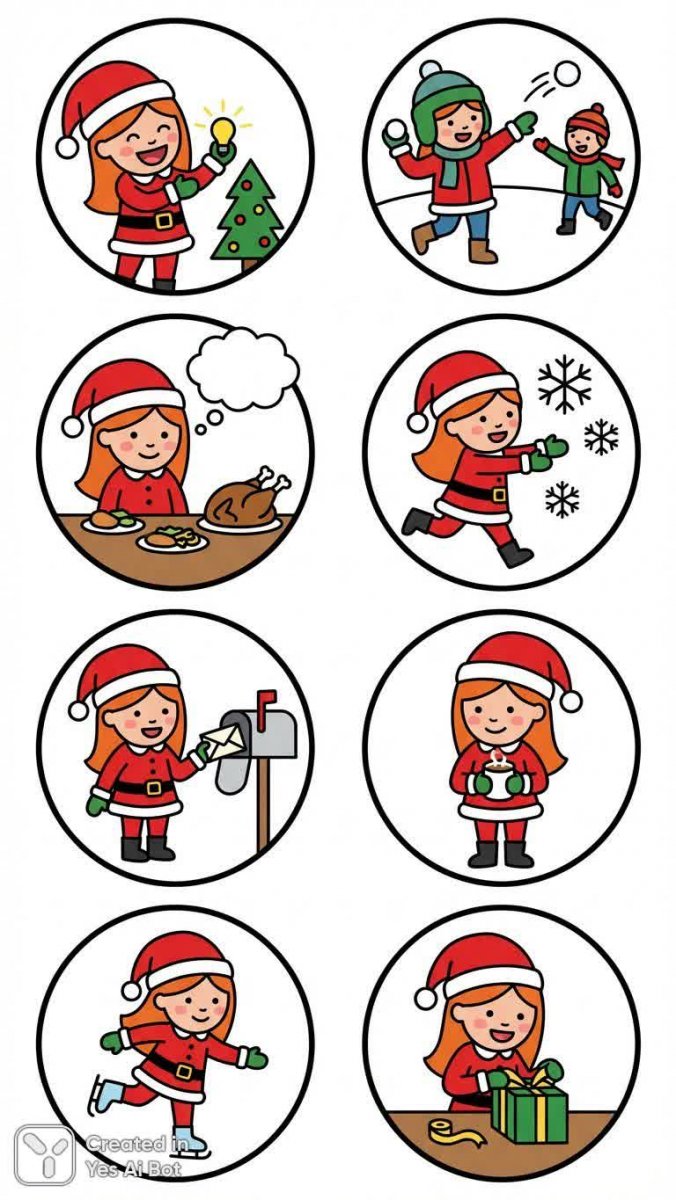 2d, png, bold line, vector art, different, minimalism, bg is white, compilation of eight stickers depicting red-haired girl in santa costume, illustrating various festive activities, first showcases her laughing while decorating a christmas tree, second features her happily battling snow with friends, third shows her looking thoughtfully at a giant holiday feast, additional stickers display her chasing after falling snowflakes and sending out holiday cards, all illustrations have whimsical charm and bold colors.