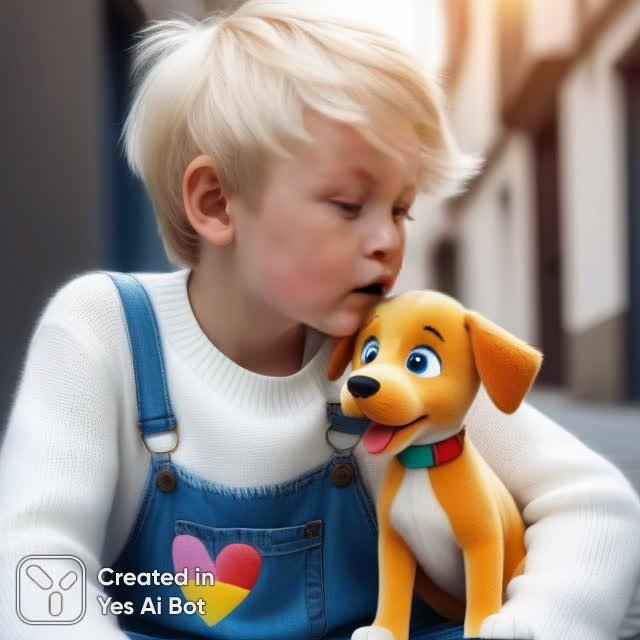 Милый мальчик с прямыми светлыми волосами и голубыми глазами запечатлен в ярком образе: на нем надет белоснежный свитер с красочным принтом в виде эмодзи и джинсовый комбинезон, украшенный забавными нашивками. Его дополняют белые кроссовки, создавая непринужденный и стильный вид. В центре внимания – трогательный момент: мальчик наклоняется, чтобы поцеловать очаровательного, но слегка недовольного лохматого уличного пса. Фотография выполнена в реалистичном стиле с использованием современных 3D компьютерных технологий, что придает изображению глубину и объем. Кажется, будто запечатлен живой момент нежной связи между человеком и животным, наполненный теплом и искренностью. Этот образ вызывает улыбку и дарит ощущение уюта благодаря сочетанию ярких цветов, милых деталей и реалистичной проработки каждого элемента. Он словно оживает на экране, приглашая зрителя окунуться в атмосферу беззаботности и радости. Этот кадр – настоящее произведение искусства цифровой графики, демонстрирующее мастерство художников и их умение передавать эмоции через визуальные образы. Вся композиция продумана до мелочей, создавая гармоничный и запоминающийся образ, который не оставит равнодушным никого