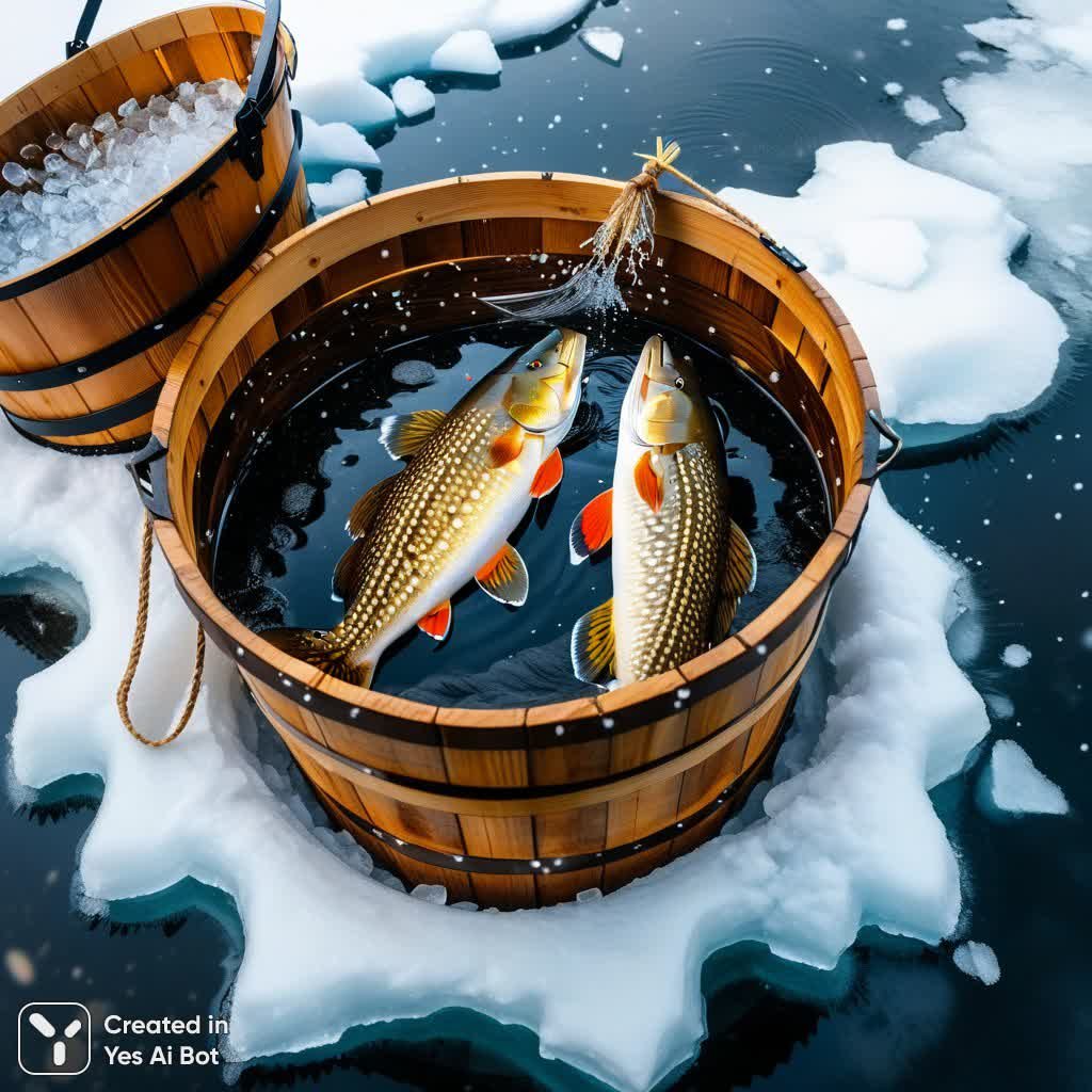 В зимнем пейзаже, у проруби во льду, застыла сцена, полная таинственности и неожиданной красоты. Деревянный ведро, словно свидетельство былых времен, стоит рядом с ледяной дырой, храня в своей глубине необычного обитателя. Внутри, на фоне сверкающих осколков льда, красуется щука – рыба-царица, облаченная в роскошный наряд. Ее чешуя переливается всеми оттенками серебра и золота, а длинное коричневое оперение ниспадает волнами по бокам, словно царская грива. На голове щуки возвышается корона, символ власти и величия, подчеркивающий ее исключительность. Рядом с первым ведром лежит второе, перевернутое набок, словно отброшенное в спешке или застывшее в момент внезапного движения. Вокруг ведра брызги воды, свидетельствующие о недавней активности и жизни, кипящей под ледяной гладью. Вся композиция пронизана ощущением сказочности и волшебства – словно из старинной легенды ожила картина, где рыба-царица восседает в своем деревянном дворце, а зимний пейзаж служит ей величественным тронным залом. Эта сцена – не просто изображение природы, это повесть о чудесах, скрытых под поверхностью обыденного мира, и напоминание о том, что даже в самых холодных и суровых местах может найтись место для красоты и волшебства. Кажется, стоит только присмотреться, чтобы увидеть тайны, которые хранит зимняя прорубь и ее необычный обитатель. Изображение запечатлело мимолетный момент, когда сказка становится реальностью, а рыба-царица открывает свой царственный взгляд на мир вокруг