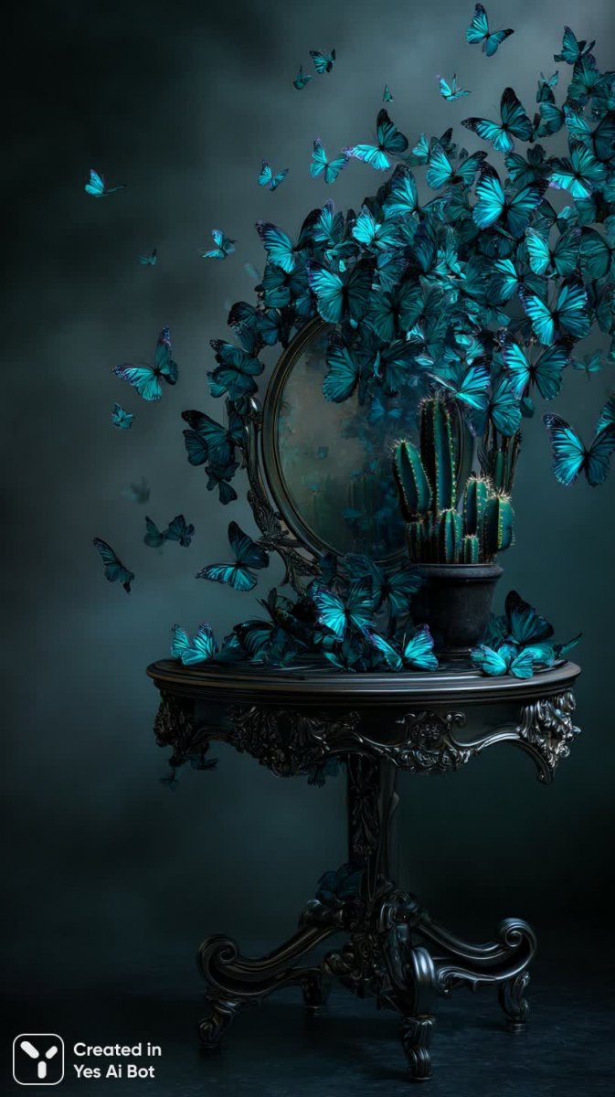 Завораживающая сцена, сотканная из мистических переливов бирюзового света и призрачных теней. Черные бабочки преображаются в небесно-голубые крылья, словно подчиняясь волшебному заклинанию. На фоне роскошного столика в стиле барокко расцветает экзотический цветок неземной красоты, излучая мягкое сияние. Изящное зеркало, будто портал в иную реальность, отражает пульсирующую энергию бирюзово-голубого цвета, наполняя пространство таинственной атмосферой. Стеклянный шар хранит внутри себя бушующий вихрь света, создавая ощущение бесконечности и непостижимости. Размытые очертания, мягкие дымчатые оттенки и эффект motion blur погружают зрителя в мир сюрреалистических грез, где реальность переплетается с фантазией, а границы между явью и иллюзией стираются безвозвратно. Картина пронизана ультрареализмом, позволяющим ощутить каждую деталь этого невероятного видения, каждый оттенок, каждое движение света и тени. Это визуальное воплощение волшебства, способное увлечь в глубины подсознания и подарить незабываемые впечатления
