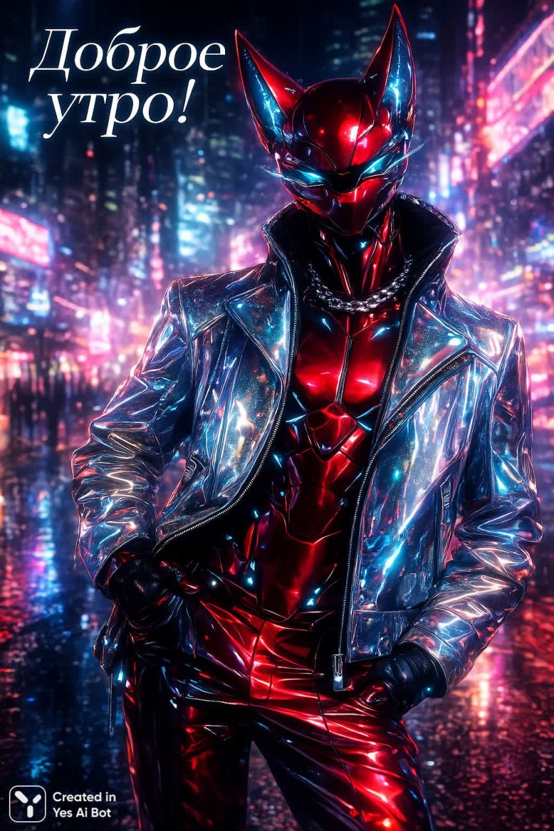text on russian: "good morning!" a futuristic anthropomorphic character with shiny red skin and glowing blue accents, adorned in a fashionable holographic jacket, stands confidently in a neon-lit cityscape at night.