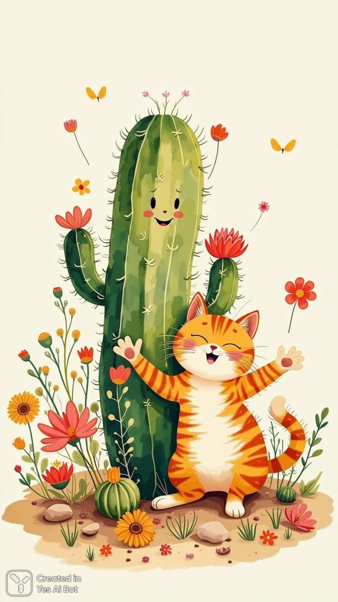 gouache illustration, naive art, whimsical scene of a playful ginger tabby cat lounging next to a cactus, the cat is striking funny poses and the cactus has a smiling face, arranged with colorful flowers around, BG is bright and cheerful with a sunny feel.