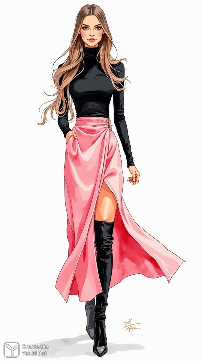 watercolor fashion illustration of woman in a flowing pink skirt with a high slit, styled with a fitted black turtleneck top, long sleek hair, wearing black thigh-high boots, walking confidently, BG is white, conveying a bold fashion statement.