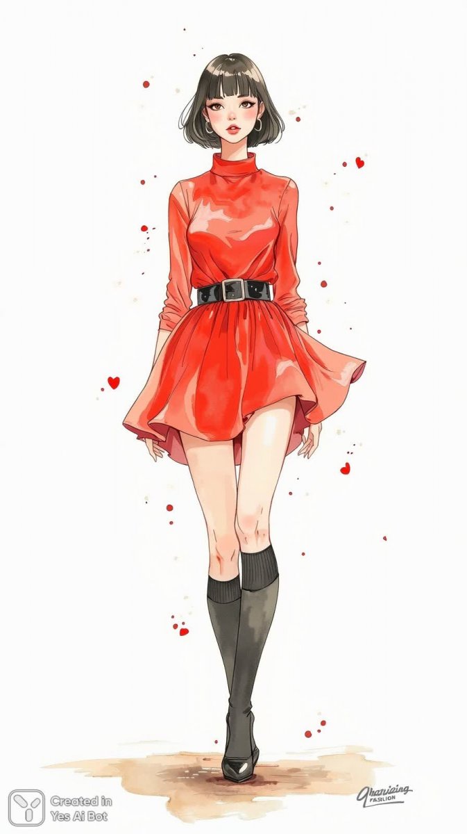 watercolor fashion illustration of woman in a vibrant red mini dress with a high neckline, cinched at the waist with a black belt, complemented by knee-high socks and sleek bob hairstyle, BG is white, showcasing a playful yet sophisticated look.