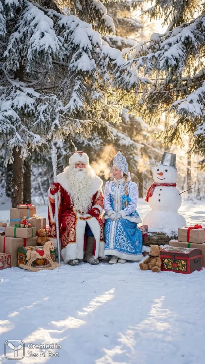 nanobanana Зимняя сказка с Дедом Морозом и Снегурочкой: волшебство русской зимы на фото. Изображение из нейронной сети NanoBanana