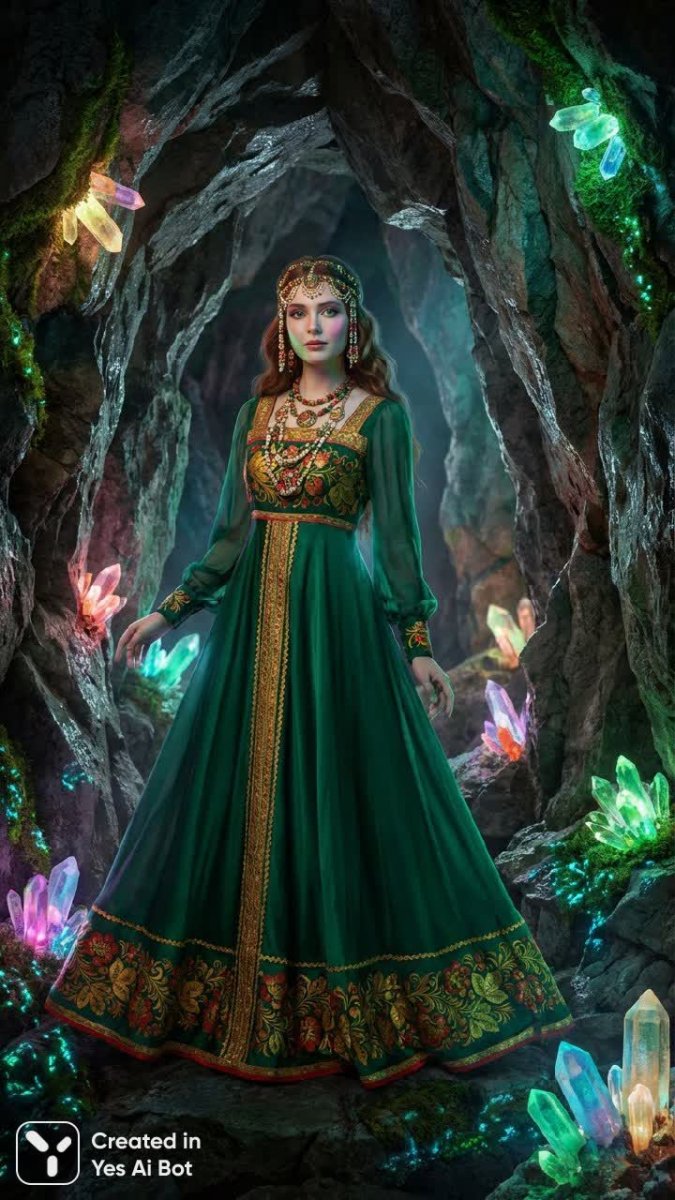 mistress of the copper mountain, enchanting lady draped in a flowing emerald dress, sparkling jewels inspired by khokhloma art, standing in a cave illuminated by shimmering crystals, otherworldly charm, professional photo.