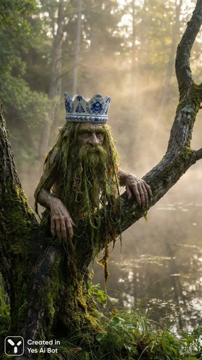 slavic folklore, vodyanoy, mystical water spirit with beard made of algae, wearing a crown adorned with intricate gzhel patterns, sitting peacefully on the edge of a magical pond, soft mist rising, enchanting atmosphere, professional photo.