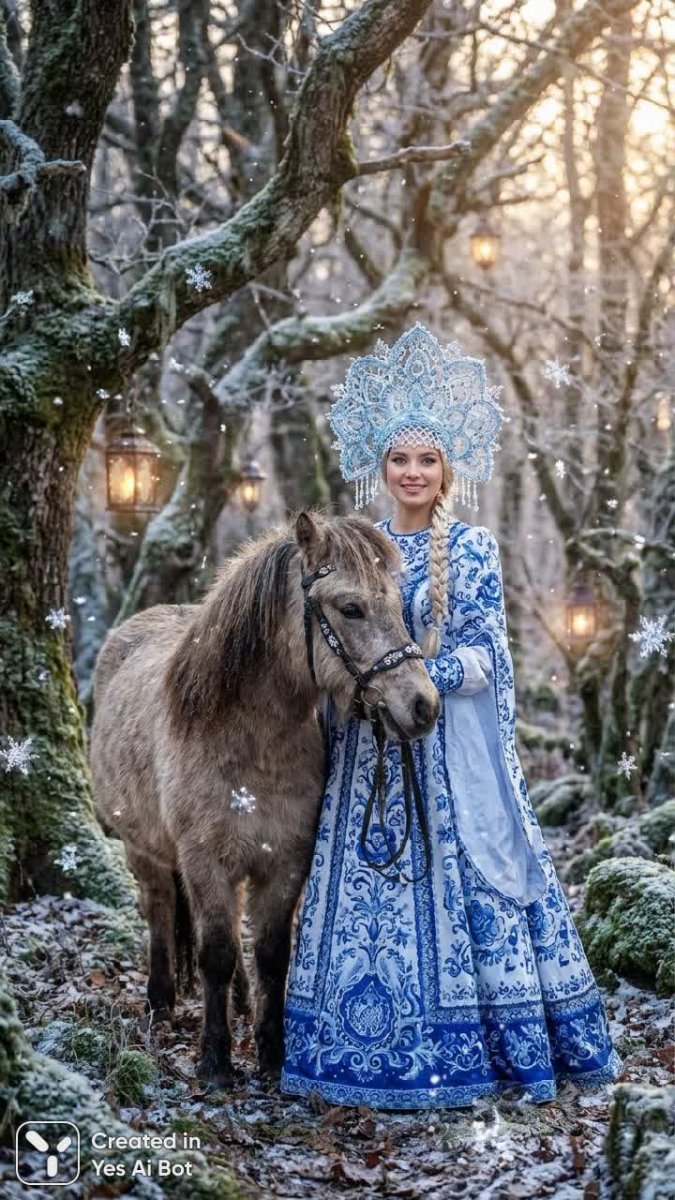 snegurochka with icy halo, standing beside a charming little humpbacked horse, sparkling snowflakes in the air, graceful porcelain-patterned dress, enchanted forest background, warm soft light, professional photo.