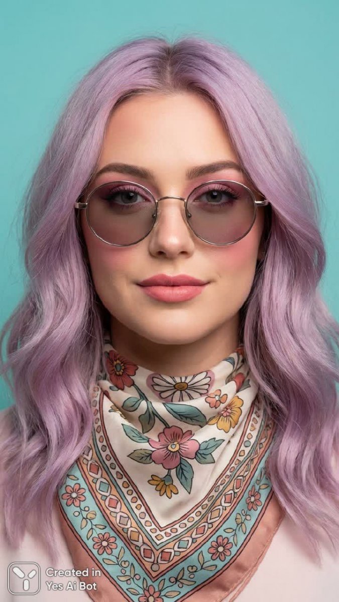close-up portrait of young woman with pastel purple hair styled in loose waves, wearing vintage round sunglasses and a quirky patterned scarf, featuring bold makeup with soft pink tones, looking directly at camera with a confident expression, BG is solid turquoise, professional photo.