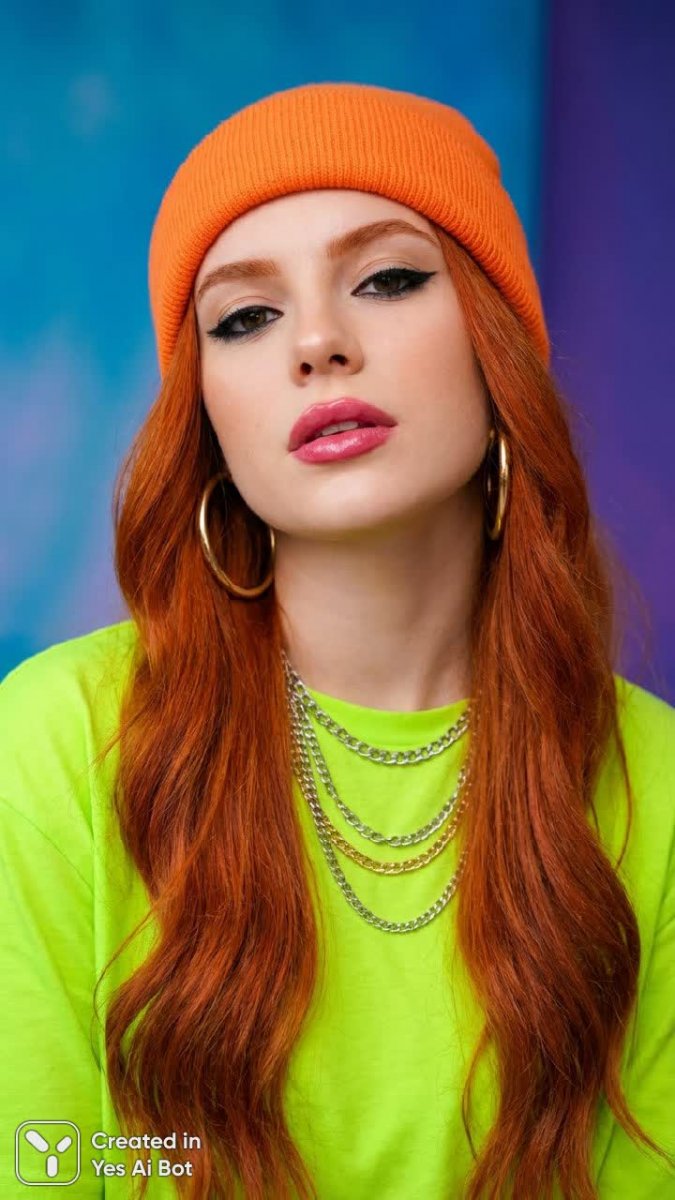 Яркий портрет молодой женщины, излучающей уверенность и стиль. Длинные огненно-рыжие волосы становятся акцентом в динамичном образе, дополненном неоново-зеленым топом и игривым оранжевым бини с крупными элементами декора. Аксессуары — большие кольца в ушах и многослойные цепочки — подчеркивают индивидуальность модели. Выразительный макияж с черной подводкой для глаз и глянцевой розовой помадой добавляет драматизма и завершенности образу. Взгляд, направленный прямо в камеру, передает силу характера и позитивный настрой. Фон выполнен в виде градиента синего и фиолетового цветов, создавая эффектное визуальное пространство, которое не отвлекает от главной героини, а лишь подчеркивает ее красоту и харизму. Профессиональная фотография демонстрирует высокий уровень мастерства фотографа, сумевшего запечатлеть все детали образа и передать настроение модели. Это портрет современной девушки, смелой, яркой и уверенной в себе, которая не боится экспериментировать со стилем и привлекать внимание. Каждая деталь продумана до мелочей, создавая гармоничный и запоминающийся визуальный образ, который вызывает восхищение и желание подражать. Фотография излучает энергию молодости и позитива, а также демонстрирует талант фотографа в создании эффектных портретов