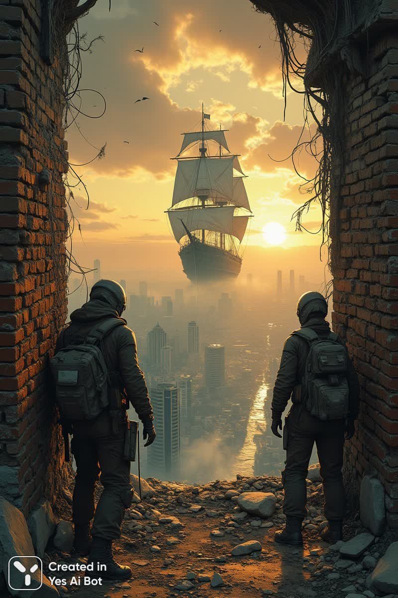 An apocalyptic ship with equal sails soars in the distance over an abandoned metropolis, an eerie atmosphere instilling fear in the early morning, a couple of survivors in this difficult world are hiding behind the bricks of a half-building, pressed against the wall, they are equipped with everything necessary for survival, a fantastic masterpiece with an emphasis on the apocalyptic future in the style of two different artists: Declan Shalvey Victoria Frances, interpreted by Iren Horrors