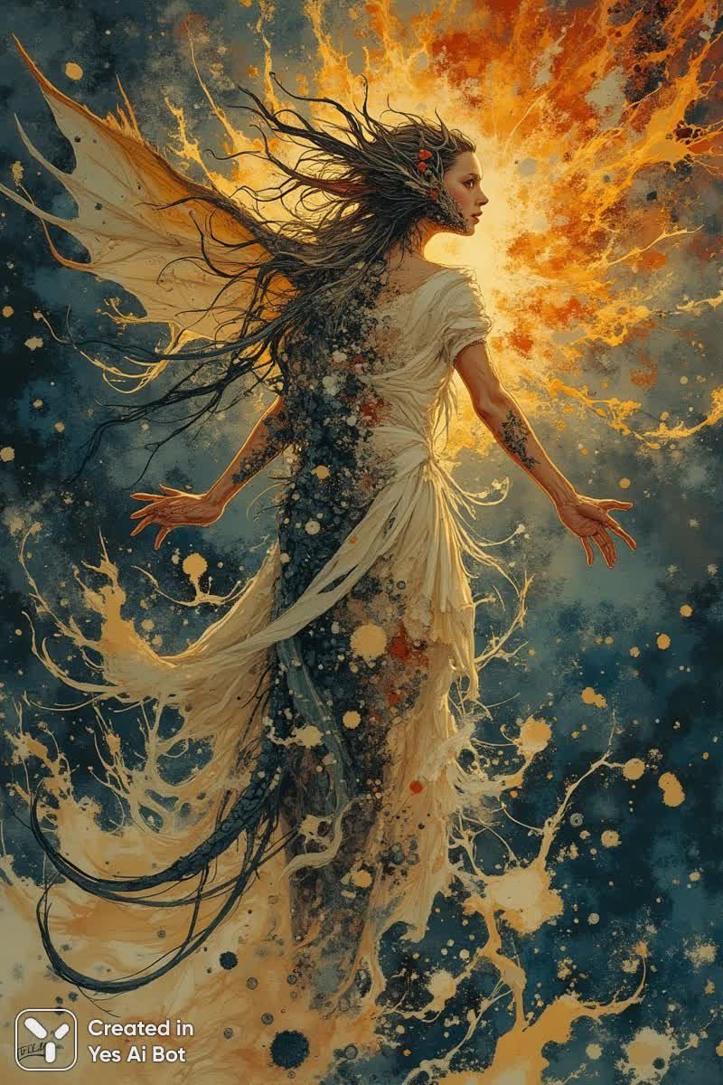 An unusual fantasy girl transforms in an instant into a dragon-like creature with a half-human body, her skin flies off in pieces, the transformation is accompanied by a bright flash of a supernova, the background consists of gloomy dark gothic colors, a masterpiece of art with colors in the styles of artists: George Cruikshank, Louis Rhead, Gabriele Dell'otto