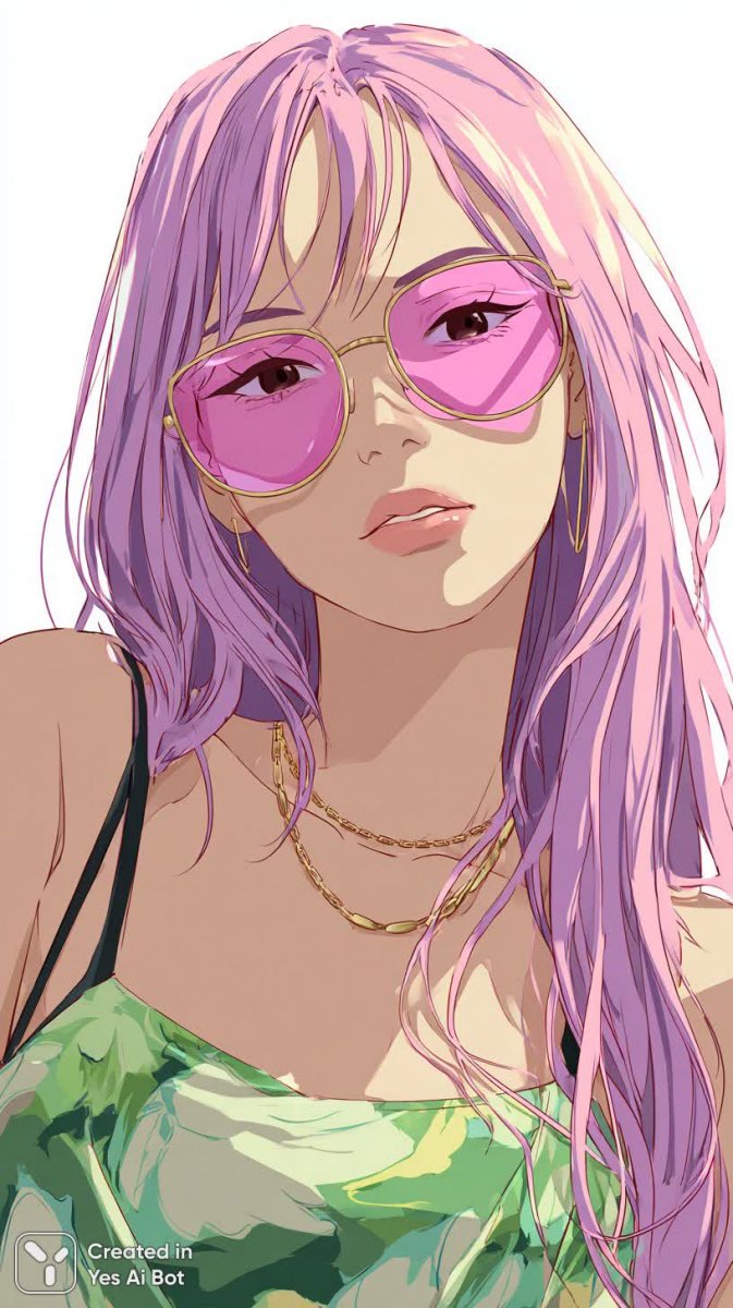 young woman with long wavy neon lavender hair, wearing oversized neon pink aviator sunglasses and a green printed tank top, accessorized with gold chain necklace, playful makeup with pastel tones, looking directly at camera with a cheeky smile, BG is solid white color, professional photo.
