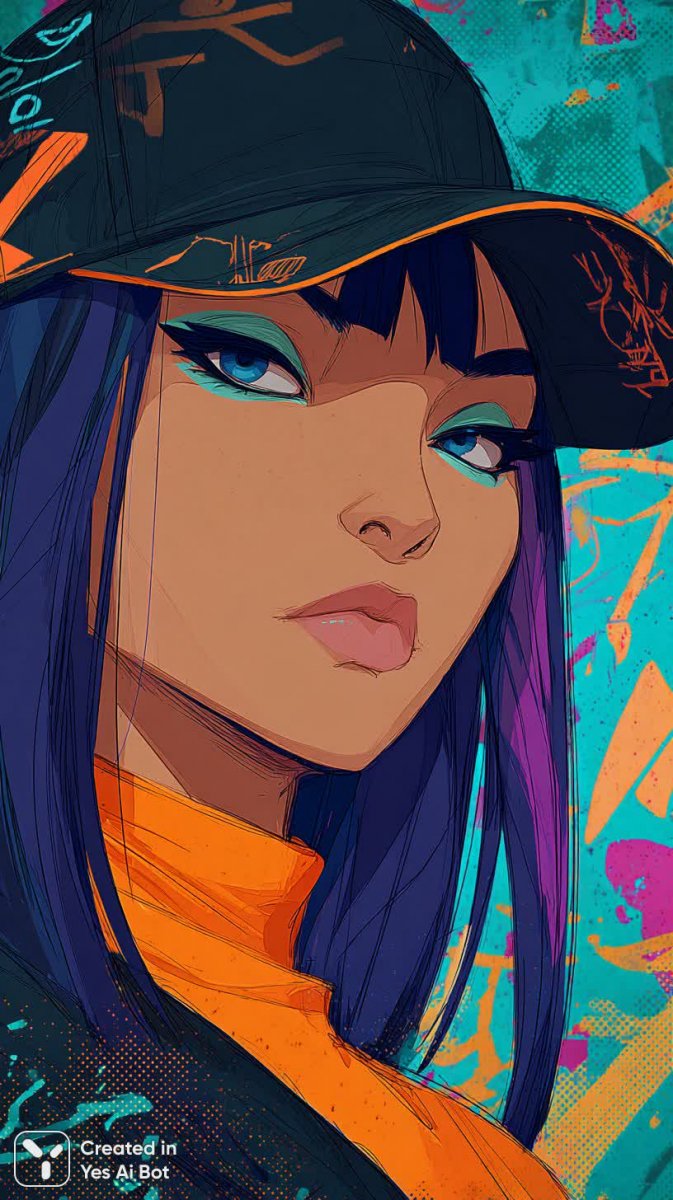 Яркий портрет молодой женщины, поражающий своей дерзостью и необычным сочетанием цветов. Короткие волосы неестественного неонового фиолетового оттенка контрастируют с глубоким синим цветом глаз, создавая эффектный визуальный образ. Черная кепка, украшенная яркой розовой вышивкой, добавляет образу городской шик и индивидуальность. Неоновый оранжевый водолазка подчеркивает энергичность и современность стиля. Макияж с использованием зеленой тени для век усиливает драматизм взгляда, а серьезное выражение лица придает портрету глубину и загадочность. Фон в виде абстрактного красочного граффити идеально дополняет общую концепцию – смелое сочетание ярких цветов и современного искусства. Профессиональная фотография передает все детали образа с высокой четкостью и качеством, делая акцент на выразительности лица модели и ее уверенном взгляде прямо в камеру. Этот портрет - воплощение современной моды, креативности и смелости самовыражения, вызывающее сильные эмоции и оставляющее неизгладимое впечатление. Это визуальный манифест индивидуальности и неповторимости, демонстрирующий красоту необычного стиля и умение выделяться из толпы. Фотография запечатлевает момент уверенности и силы, отражая внутренний мир яркой и харизматичной личности